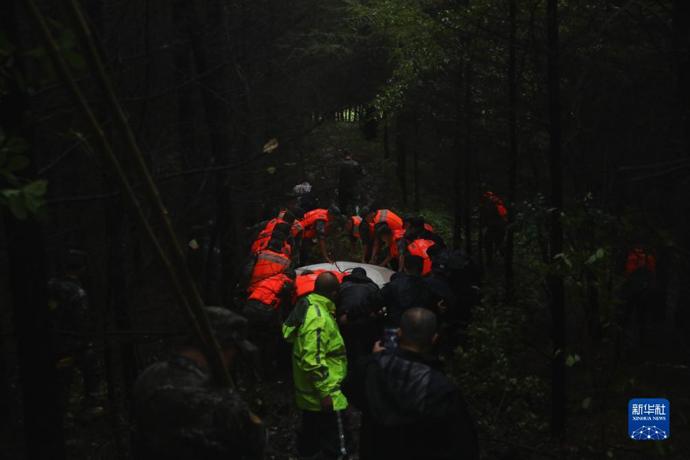 8月7日,武警黑龍江總隊牡丹江支隊官兵正穿過密林準(zhǔn)備將沖鋒舟抬至海浪河岸邊。新華社發(fā)(劉飛 攝)
