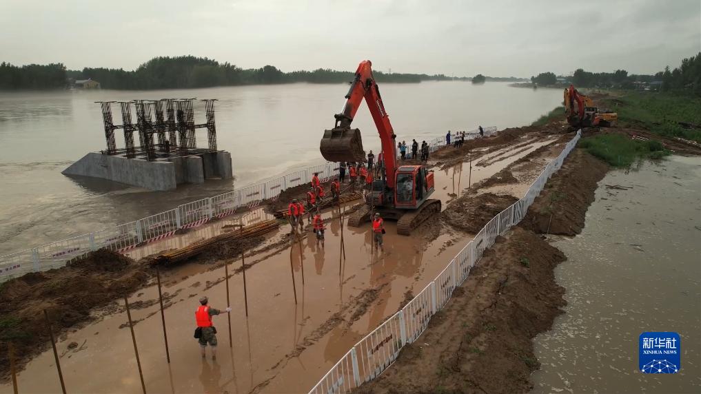 陸軍第82集團(tuán)軍某勤務(wù)旅官兵在河北涿州市東茨村大橋進(jìn)行巡堤筑壩任務(wù)(8月2日攝)。新華社發(fā)(鄧青華 攝)