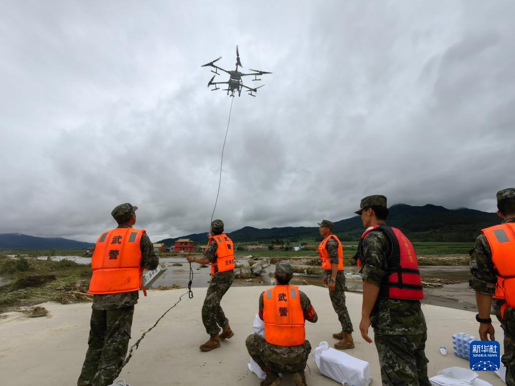 武警吉林總隊吉林支隊官兵利用無人機(jī)向舒蘭市開原鎮(zhèn)五滴村小鄉(xiāng)屯90余名被洪水圍困的群眾空投食品和飲用水(8月6日攝)。新華社發(fā)(曹孟澤 攝)