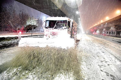 ??12月11日深夜兩點,鄭州市公用集團(tuán)出動鏟雪車在北三環(huán)立交下除雪 正觀新聞·鄭州晚報記者 周甬 圖