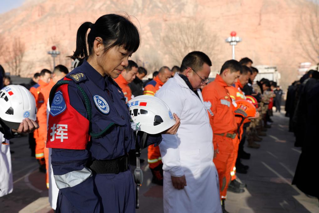 ??25日上午,甘肅省積石山縣大河家鎮(zhèn)舉行深切悼念積石山6.2級地震遇難同胞默哀儀式。救援隊伍、醫(yī)護人員、群眾代表等各界代表默然肅立,為地震遇難同胞默哀。
