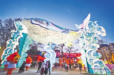 ??經過快捷有序安檢,游客魚貫而入。這里不僅有金黃銀杏葉組成的“姓氏起源”樹,還有巨大鯨魚與藍色波浪融為一體的“海晏河清”燈組。記者從現(xiàn)場了解到,“鯨魚”正下方就是主會場,不定時會有各種節(jié)目表演來充當氛圍組。不一會兒,憨態(tài)可掬的“祝融熊貓”、悠揚動聽的民族樂器、精彩絕倫的“木偶變臉”就在這兒輪番上演,引得圍觀人群歡呼連連。