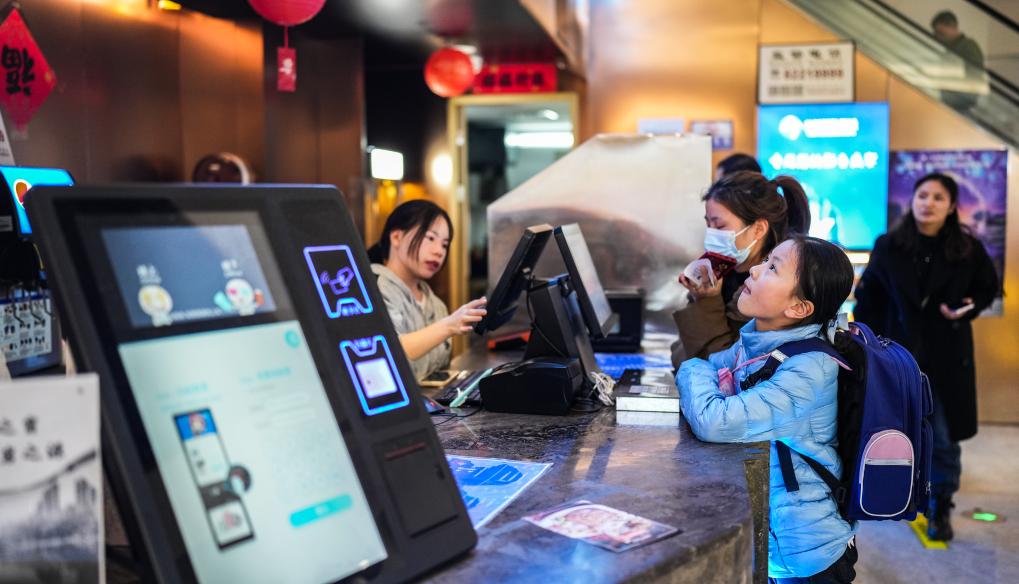 ??2月18日,小朋友在貴陽市云巖區(qū)益田國(guó)際影城選購(gòu)電影票。新華社記者 陶亮 攝