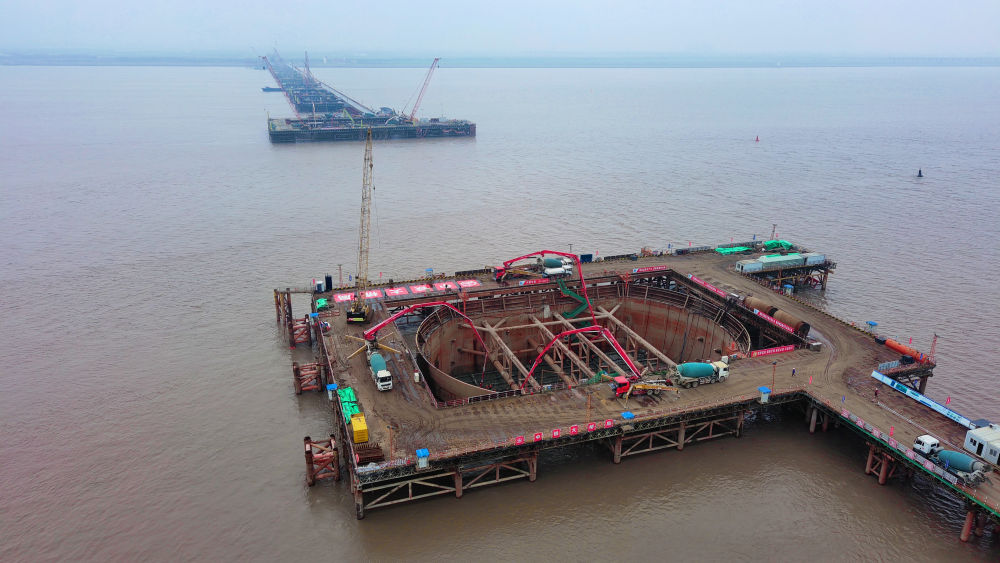 ??2024年3月27日,在江蘇啟東長江入海口北支航道江面施工現(xiàn)場,上海至南京至合肥高鐵控制性節(jié)點工程——崇啟公鐵長江大橋3、4號主墩承臺首次澆筑完成。