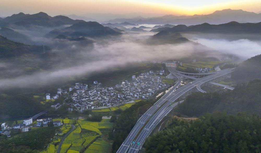 ??這是2024年3月20日拍攝的位于安徽省黃山市歙縣的黃千高速公路。黃千高速公路依山傍水,是連接安徽黃山和浙江千島湖兩大景區(qū)的旅游快速干線(無人機照片)。