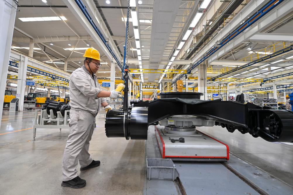 ??4月9日,工作人員在太重集團(tuán)智能高端液壓挖掘機(jī)產(chǎn)業(yè)園區(qū)內(nèi)的智能生產(chǎn)線上作業(yè)。新華社記者 楊晨光 攝