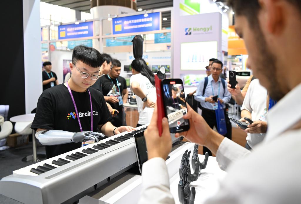 ??4月17日,佩戴智能仿生手的參展商工作人員在第135屆廣交會(huì)第一期“智慧生活”專區(qū)強(qiáng)腦科技展臺(tái)演奏電子琴。新華社記者 鄧華 攝