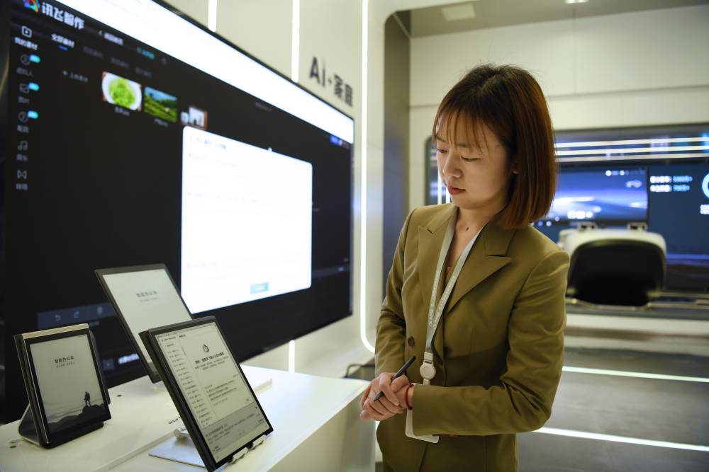 ??2024年1月19日,工作人員在科大訊飛股份有限公司介紹一款智能辦公本。新華社記者 張端 攝