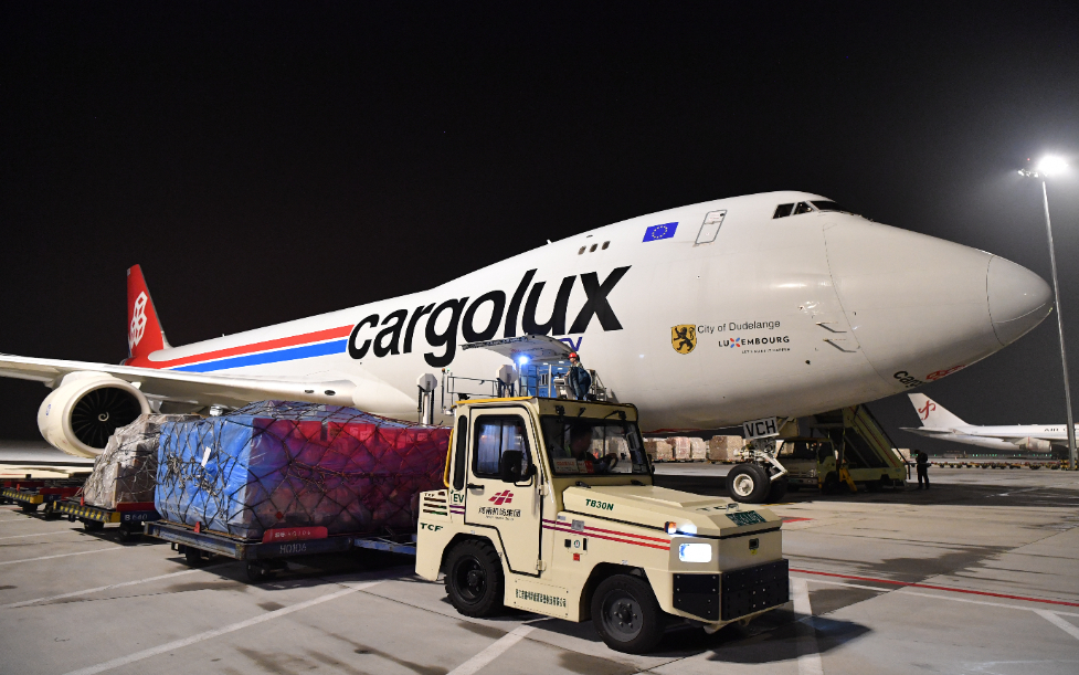 ??在鄭州新鄭國際機(jī)場,工作人員駕駛新能源拖車為一架盧森堡貨航貨機(jī)卸貨(2023年8月1日攝)。新華社記者 李嘉南 攝