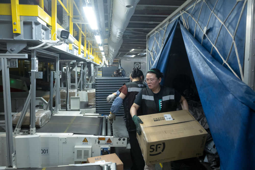 ??2024年5月25日凌晨,工人在湖北鄂州花湖國際機(jī)場轉(zhuǎn)運(yùn)中心進(jìn)行分揀作業(yè)。新華社記者 肖藝九 攝