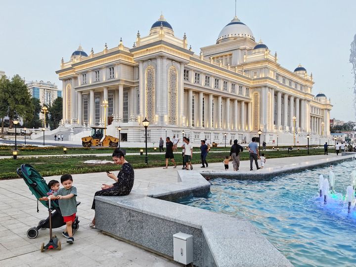 ??2024年6月29日,在塔吉克斯坦首都杜尚別,人們?cè)谒怂固棺h會(huì)大樓前休閑。新華社記者 申宏 攝