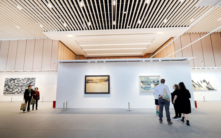 ??11月9日,觀眾在第七屆進博會國際現(xiàn)當(dāng)代藝術(shù)專區(qū)觀看繪畫藝術(shù)展品。新華社記者 方喆 攝