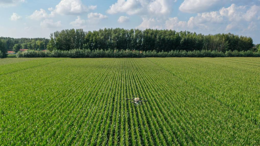 ??2024年8月8日,在吉林省梨樹縣孤家子鎮(zhèn),無人機(jī)為作物施肥(無人機(jī)照片)。新華社記者 張楠 攝